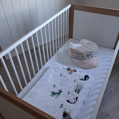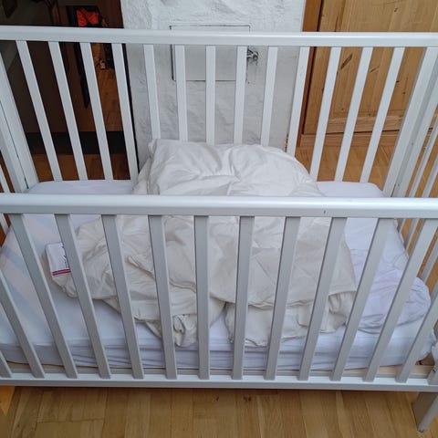 Solid og tidløs barneseng laget i heltre eik av erfaren møbelsnekker. Sengen er tilpasset spedbarn og holder svært høy kvalitet.