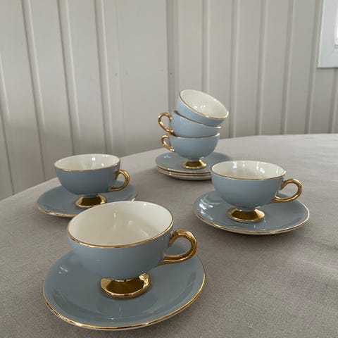 To kopper med skåler fra Egersund flint Norway. Alle deler i fin stand uten skår/krakeleringer, med dyp gul farge og inntakt gull. Selges samlet kr. 500,-