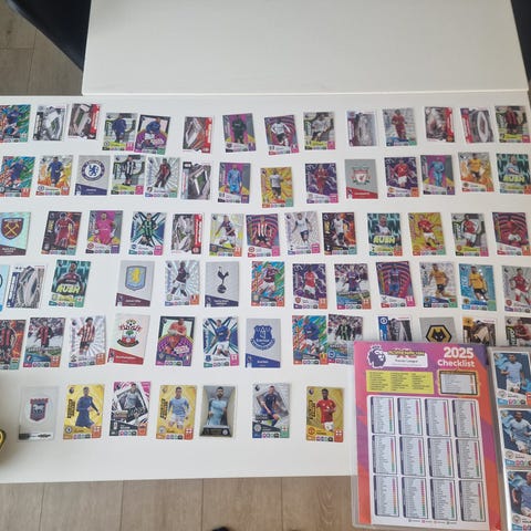 Panini Adrenalyn XL samling fotballkort med samlealbum og spillebrett. Settet inneholder et variert utvalg kort fra ulike serier og spesialkorttyper, noe organisert i plastlommer, men hovedsakelig i løse bunker. Totalt rundt 650 kort.