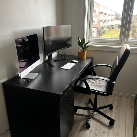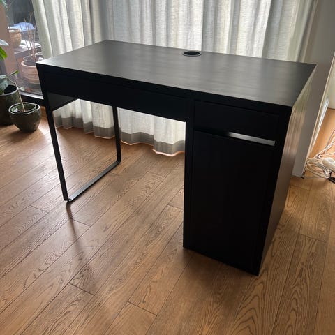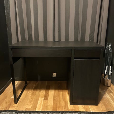 Selger et Micke skrivebord fra IKEA i fargen brunsvart. Den største skuffen mangler siden det ble for trangt for en voksen å sitte under. Ellers som ny. Må hentes.