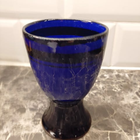 Keramiker Carl Olaf Olsen har laget de 5 krusene med hank i nyanser fra blått til brunt. keramikk Krusene er håndlaget med varierende blå glasur utvendig og lys, spraglet glasur innvendig. De har kun stått til pynt, men egner seg godt til servering av varme og kalde drikker til frokost, lunsj, kvelds eller en kaffestund med sitt enkle, funksjonelle og vakre utseende.