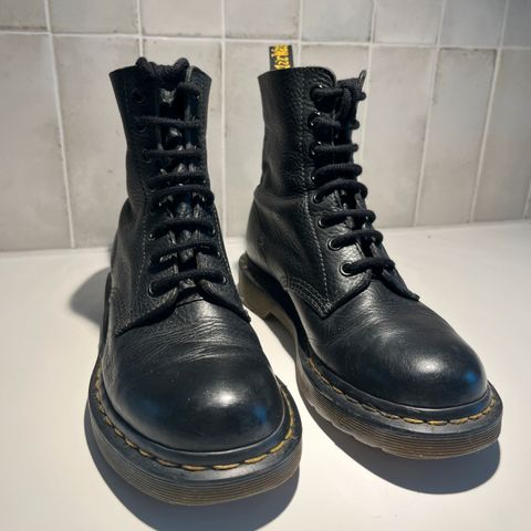 Dr. Martens skinn boots med snøring, svarte med gule detaljer i str. 39