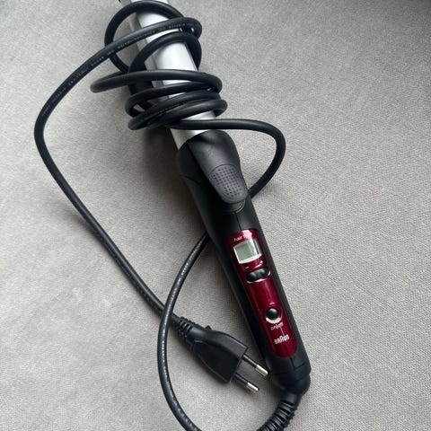 Krølltangen har sylinderformet varmeelement, håndtak i svart plast og strømledning med støpsel. Egnet til styling og forming av hår.