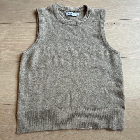 ONLY genser vest for dame i størrelse S. Ermeløs, ribbestrikket modell i beige akryl. Bred ribbekant nederst og rundt halsåpningen. Passer til bruk over skjorte, t-skjorte eller alene som en lett topp.