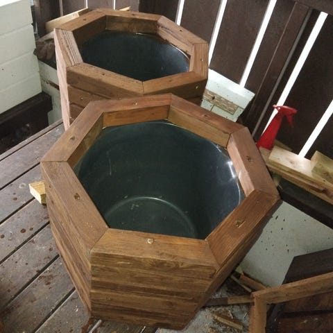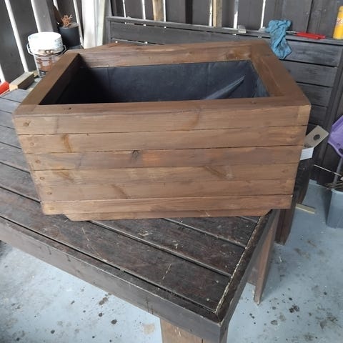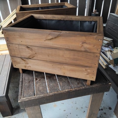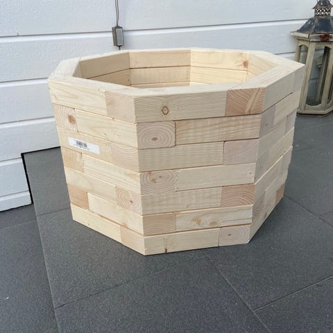 8 KANTET BLOMSTERKASSE LAGET AV IMPREGNERT MATERIALE MED PLAST BALJE INNVENDIG FERDIG BEISET KLAR TIL BRUK