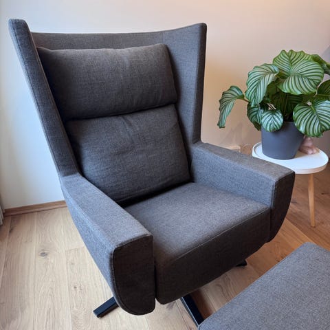 Nesten ubrukt lenestol fra Slettvoll. Har kun stått i et hjørne. Det er en flekk ca midt på stolen fra noe søl - se bilde. Dette skal nok gå an å få bort ved møblerens. Fargen er mørk grå med blåskjær.