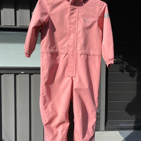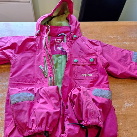 Fargen på dressen er en mellomting mellom rosa og beige (raspberry), Stoffet er som nytt, du kan ikke se noen som helst slitasje, kun benyttet to ganger. Dressen har 10.000 mm vannsøyle, tapede sømmer, er vindtett og har forsterkningsmateriale på utsatte områder.