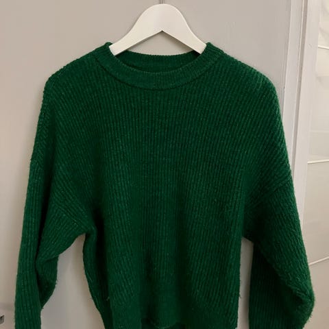 Strikket genser. Mer eplegrønn enn på bildet. Overvidde 112 cm. Lengde foran 45 cm. Noe nupper, men pent brukt.