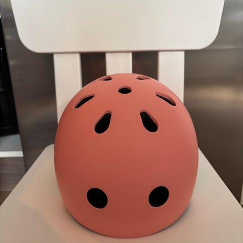 Jofa hjelm i rosa farge. Hjelmen har flere ventilasjonshull og refleksformede trekantmarkeringer foran og bak. Justerbar stropp under haken. Egnet som beskyttelseshjelm til aktiviteter som skøyter, avhengig av størrelse og passform for brukeren.