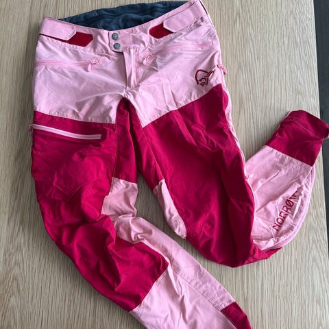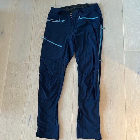 Norrøna Fjørå flex1 turbukse for dame i størrelse S. Buksen er i en lett og teknisk modell til fottur. Farge blå med turkise detaljer, blant annet glidelåser og Norrøna-logo på låret.