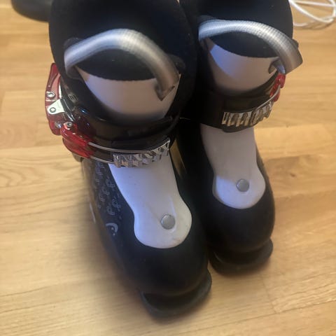 Head alpinstøvler for barn i svart, grå og gul farge. Støvlene har fire justerbare spenner i metall og polstret, grå innersko for økt komfort. Sålen er merket med størrelsene 230/235 mm inni støvlene. Egnet til alpint bruk for barn som trenger stabile og justerbare skistøvler.