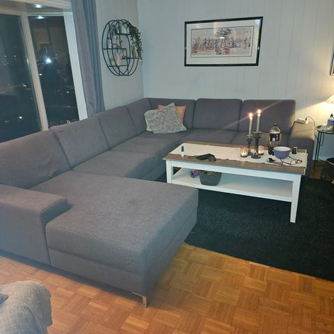 Hjørnesofa gis bort. Det er en 3 + 1,5 seter Modern Living sofa, kjøpt på Living for ca 15 år siden. Sofaen har cosy corner hjørne, som er veldig godt å krype opp i foran tv-en.