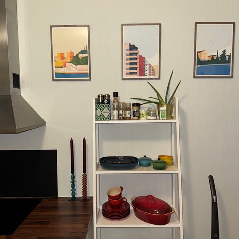 Selger denne kjempefine tallerkenhyllen da jeg ville ha et bilde på veggen istedenfor. Hyllen er kjøpt brukt og beiset mørkere av meg.