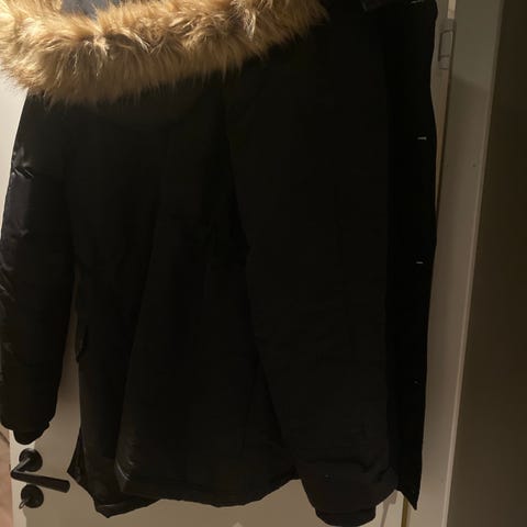 Svea vinterjakke for dame i størrelse S. Jakken er svart og laget i polyester. Den har hette med fuskepelskant og glidelåslukking foran. Detaljer inkluderer Svea-logo og et påsydd merke med flaggmotiv på ermet. Egnet som ytterjakke i kaldere vær.