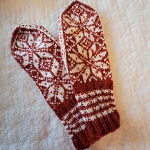 Fine mørkebrune og hvite selbuvotter i ull.