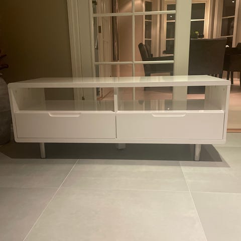 Svart tv benk med hull til ledninger i to av hyllene selges.