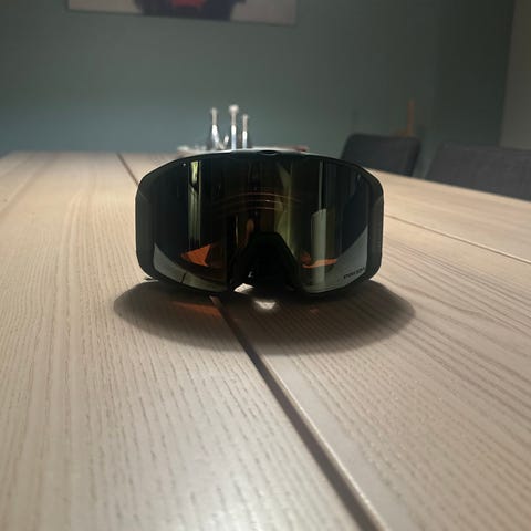 Brillen har buet linse med speilende grønn finish som dekker godt rundt øynene. Stroppen er justerbar med Oakley-logo på siden. Det følger med et eget etui/veske for oppbevaring av brillen. Egnet til alpint, snowboard og annen vintersport der man trenger øyebeskyttelse mot snø og sollys.