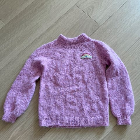 Cirka størrelse 3/4 år. Brukt av en jente. Strikket i kløfritt kvalitetsgarn.
