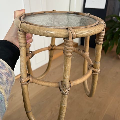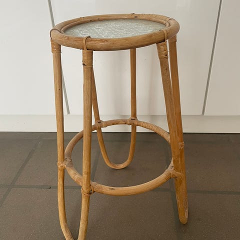 Fin og dekorativ blomsterpidestall i natur bambus/rotting med original glassplate.