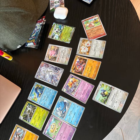 Pokémon samlekort blandet lot med ulike korttyper. Bildene viser blant annet flere holo- og full art-kort, noen i plastlommer. Kortene ser ut til å være fra forskjellige serier og utgivelser, med både vanlige og mer spesielle motiv. Egner seg for samlere av Pokémon-kort som ønsker en variert samling med ulike motiver og design. Se bildene for innhold og detaljer om de enkelte kortene.