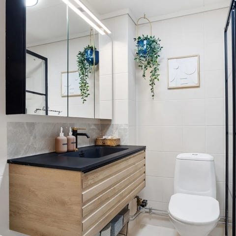 Baderomsinnredning servantskap høyskap speilskap treverk hvit servant