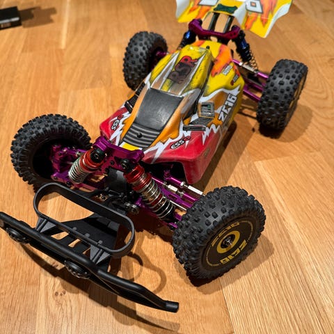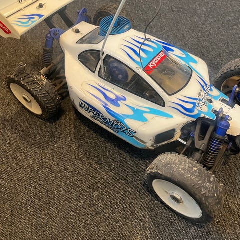 Bilen trenger noen klips til å feste body og radioboks pluss ett par strips til luftfilter og potte. Bilen har stått lenge så ett nytt luftfilter fortjener den😊Legger ved gløder m/lader hvis ønskelig.