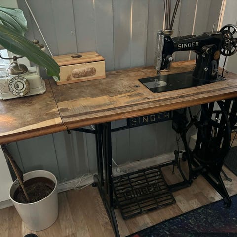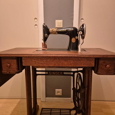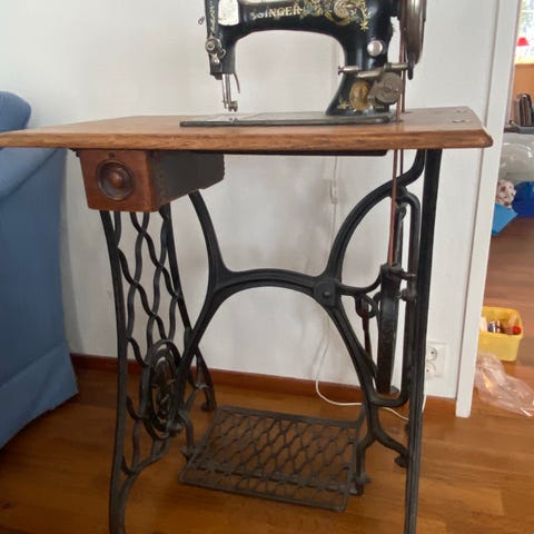 Singer mekanisk symaskin med trebord og støpejernsunderstell
