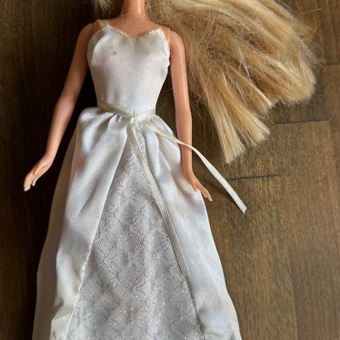 Barbie dukke med langt blondt hår kledd i et todelt sølvfarget antrekk. Overdelen er en kortermet topp i skinnende stoff, og nederdelen er et langt skjørt med splitt og blondefelt foran. Dukken har bevegelige armer og ben. Egnet som lekedukke for barn eller til samling og rollelek.