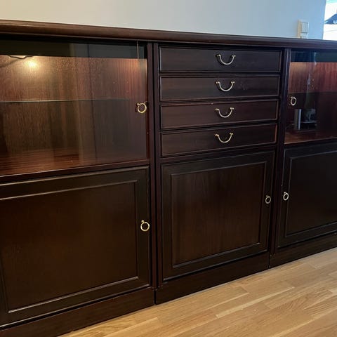 Klassisk skjenk med 3 skuffer og 3 skap i fin stand, noen småmerker men både skuffer og skaphengsler i perfekt stand