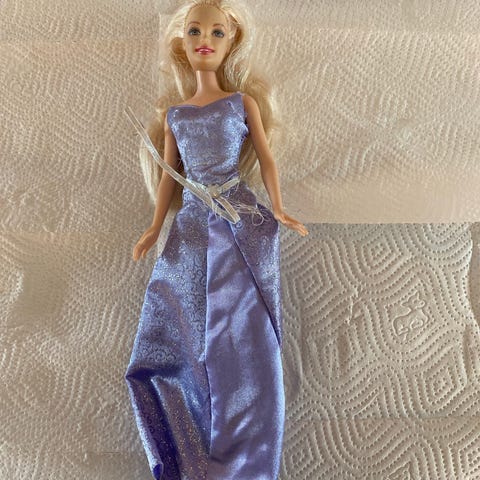 Barbie dukke med langt brunt hår og bevegelige armer og ben. Dukken har på seg en lang, lilla kjole med flere lag stoff og volang nederst. Passer til lek med Barbie-dukker og tilbehør i samme skala.
