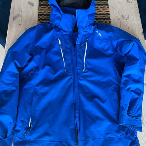 Jakken er blå og laget i Gore-Tex Infinium-materiale, som gir vindtett og vannavvisende ytterstoff. Den har fast hette, gjennomgående glidelås i front og justering nederst. Innsiden har vattert fôr i kontrastfarge samt innvendige og utvendige lommer med glidelås.
