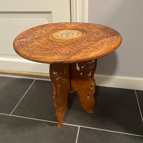 Rundt sidebord/"røkebord" i tre med utskåret bordplate. Bordplaten har dekorativt utskårne blomster- og rankemønstre langs kanten. Understellet består av kryssende, dreide ben i tre som gir bordet et skulpturelt uttrykk. Passer som sidebord eller kaffebord i stue, entré eller andre oppholdsrom. Skåret i 2stykker heltre; en bordplate og sammenleggbare bordbein i hvert sitt stykke. Meget pent arbeid! Høyde 50 cm, diameter 50 cm.