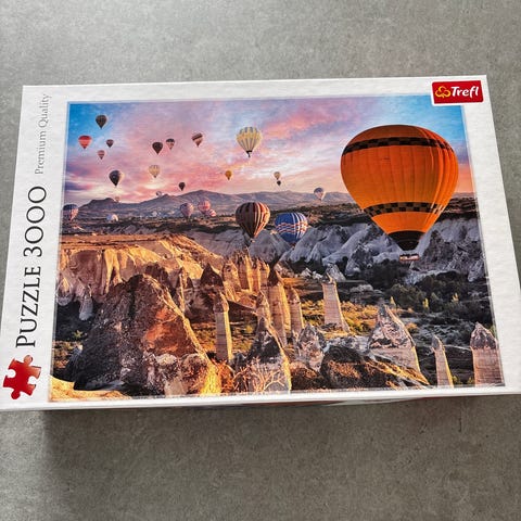 Puslespill med motiv av luftballonger over et landskap. Puslespillet består av 1000 brikker og er kjøpt på paradox museum i Oslo.
