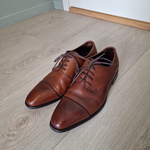 Bertoni pensko i størrelse 40. Klassiske snøresko i brunt skinn med lett spiss tåform. Yttersåle i gummi med hæl. Skoene passer til penbruk, for eksempel til dress eller andre formelle og semi-formelle anledninger. Brukt et par ganger.