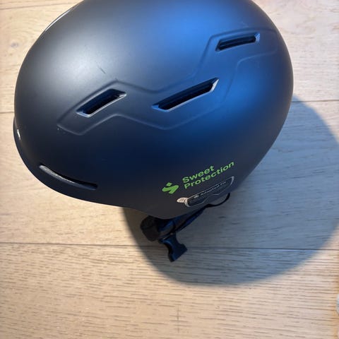 Sweet Protection skihjelm i størrelse youth S. Hjelmen er blå med svart innside og justerbar hakereim og justerhjul bak. Modellen har øreputer og ventilasjonsåpninger foran og bak. Egnet til ski, skøyter og snowboard. 49-53 cm