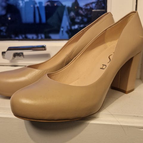 Lys pensko med hæl på 8cm. Lite brukt, er som ny. Størrelse 38. Merke unisa.