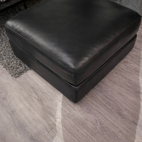 Svart puff i ekte skinn med vattert, rutet overflate. Puffen har metallben og rektangulær form. Egner seg som fotskammel, ekstra sitteplass eller som liten avlastningsflate i stue eller oppholdsrom. Selges grunnet flytting.