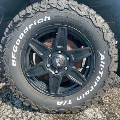 Eine felgen har fått seg eit skrap av tidligere eiger, sjå bilde. Ellers er felgane i meget god stand.