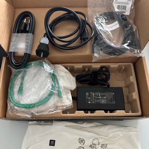 Settet inneholder en kompakt dokkingstasjon med flere tilkoblingsmuligheter, blant annet nettverksport (RJ45), USB-porter, HDMI og DisplayPort. I tillegg følger det med ekstern strømforsyning, strømkabler og flere skjermkabler (DisplayPort og HDMI), samt en C2G-merket kabel i original emballasje.