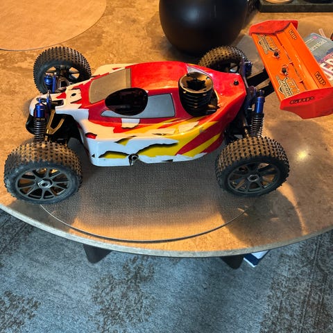 Bilen trenger noen klips til å feste body og radioboks pluss ett par strips til luftfilter og potte. Bilen har stått lenge så ett nytt luftfilter fortjener den😊Legger ved gløder m/lader hvis ønskelig.