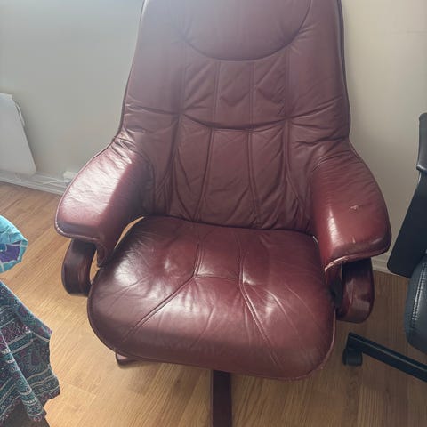 God å sitte i ,e r justerbar . Kunstig skinn ,rolig blålig farge.