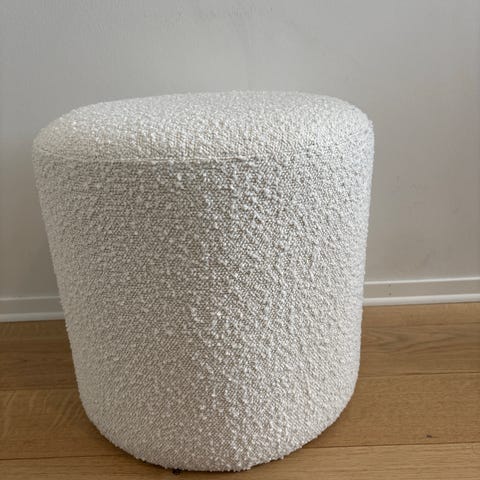 Grei puff i lys grå velur. Ingen flekker/merker. 39 cm høy, diameter 38 cm. Lett å flytte. Ingen oppbevaringsrom.