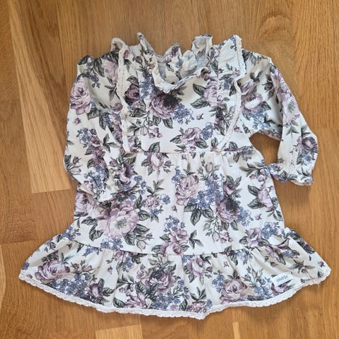 Newbie kjole for barn i størrelse 98. Kjolen er flerfarget med mønster og har lange ermer. Den er laget av bomull og er beregnet for jente. Passer godt til hverdagsbruk eller enklere penere anledninger, og kan kombineres med strømpebukse eller leggings etter behov.