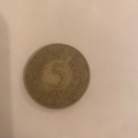 Selger en klassisk tysk 5 Deutsche Mark mynt fra 1951 med den ikoniske ørnen. Fin samlermynt fra etterkrigstiden og populær blant samlere av tyske mynter.