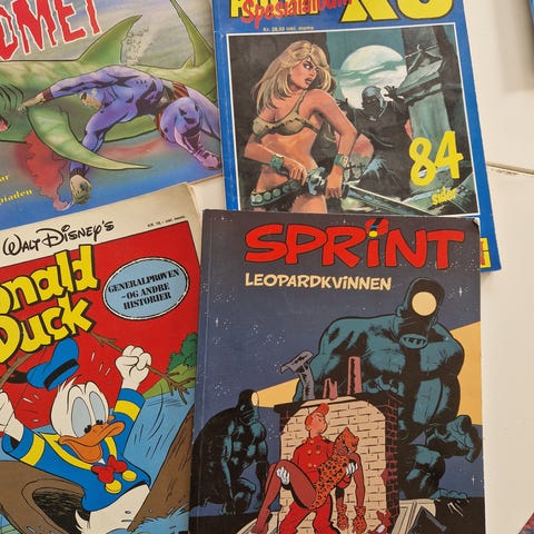 Her er det Donald duck mm, norske superhelt tegneserier, mye Marvel, DC osv på engelsk.