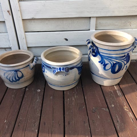 Gamle håndlagde leirkrukker- Hollandske krukker vurderes solgt.