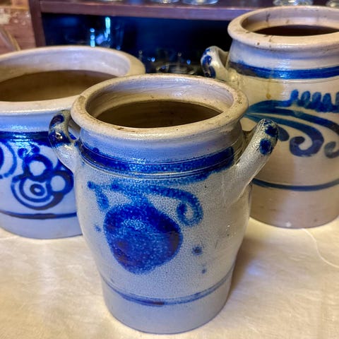 Leirkrukkene er saltglasert og dekoren er malt for hånd.