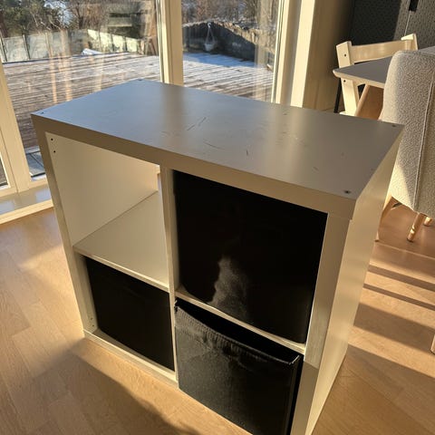 Kallax hylle med 3 skapinnsatser og to kryss innsatser.