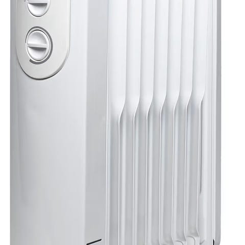 Konvektorovn i hvit farge med sorte endestykker og føtter. Ovnen har mekanisk termostat og brytere på siden for innstilling av varmeeffekt. Den står på gulvet med integrerte ben og har luftutslipp på toppen for å fordele varmen i rommet. Frittstående konvektorovn med vifte, 2000 W.