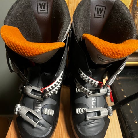 Salomon Evolution Comfort alpinstøvler i størrelse 27,5. Støvlene er i grå og hvit farge med fire justerbare spenner og powerstrap øverst for bedre tilpasning rundt leggen. Modellen har plastskall med innerstøvel som gir støtte og komfort ved alpin kjøring. Passer til bruk i alpinbakke med vanlige alpinbindinger.